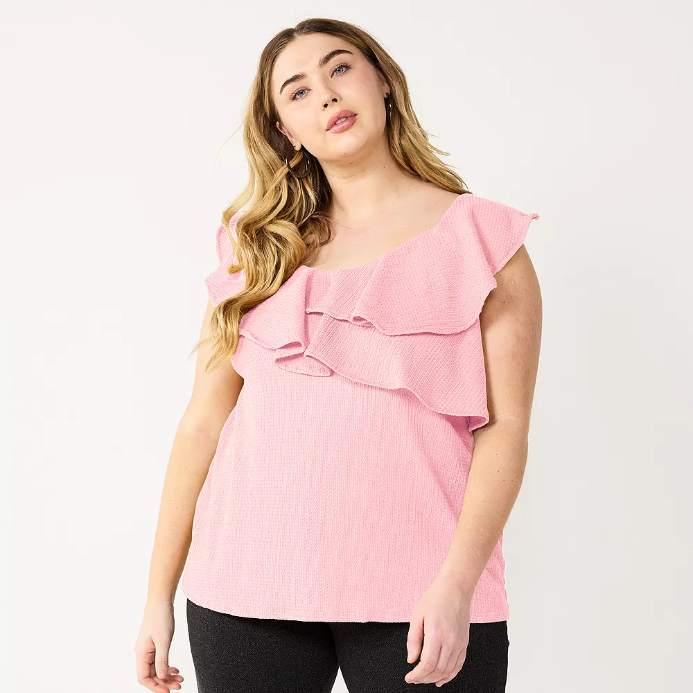 Add a little sweetness to your wardrobe with this plus size women’s sweetheart neckline ruffled top from Nine West.