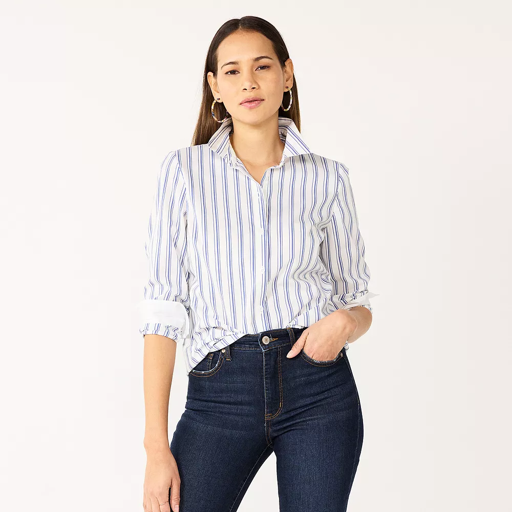 For a look that’s flattering, look no further than this women’s structured button-down shirt from Nine West.